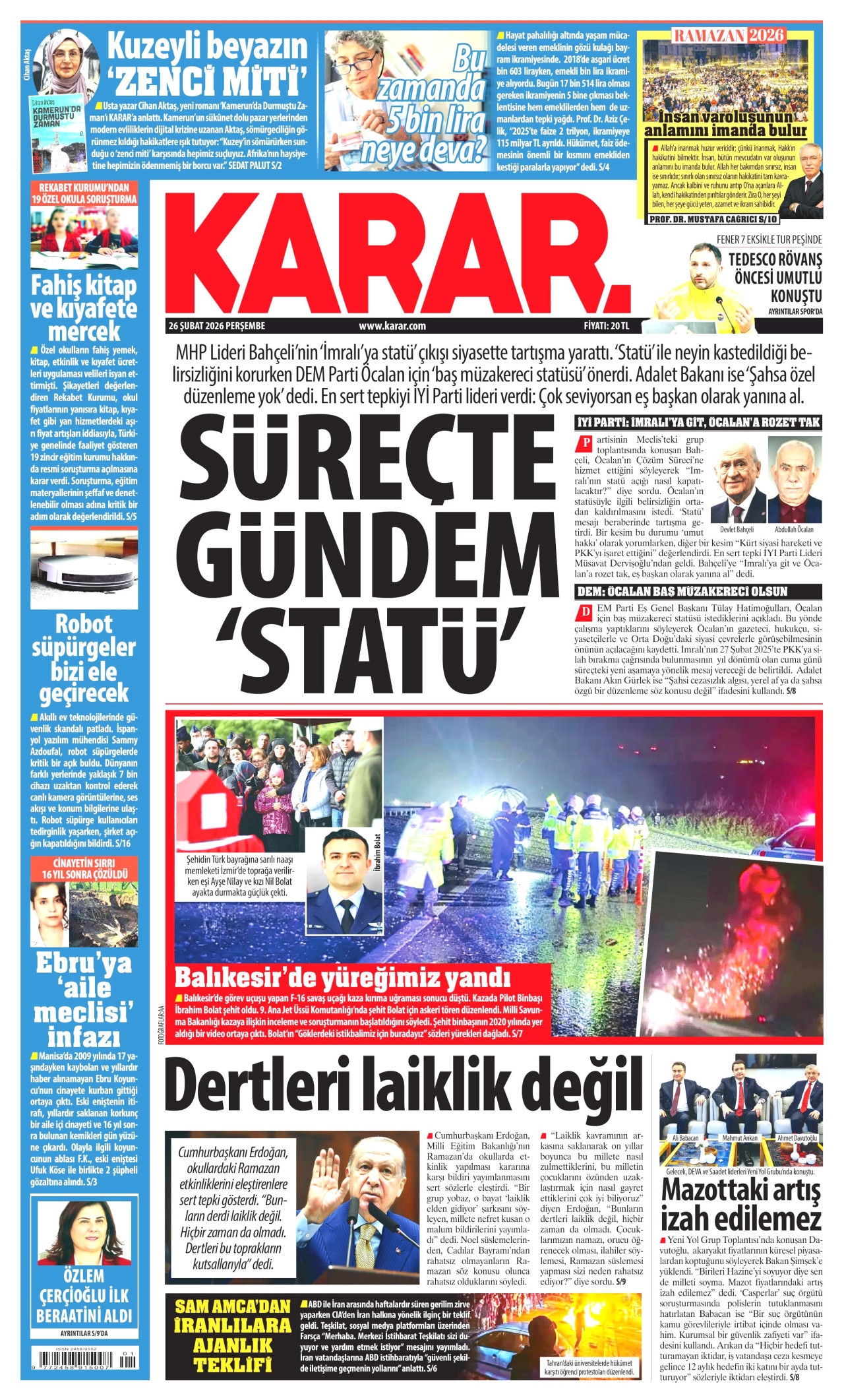 KARAR Gazetesi 26 Şubat 2026, Perşembe Günü Manşeti